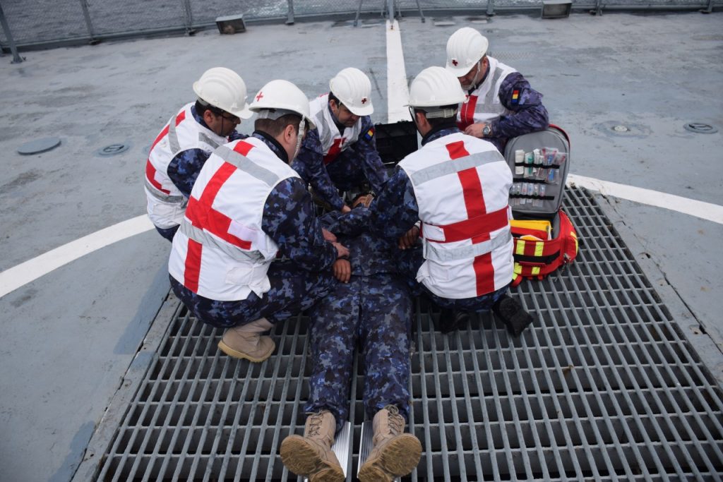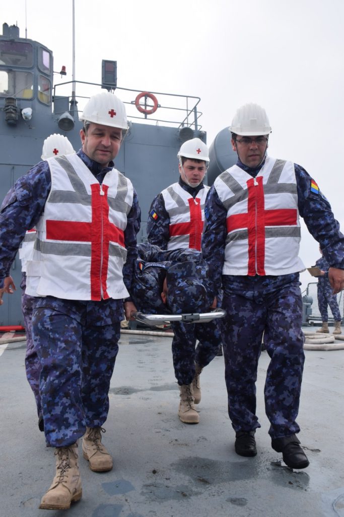 As a first, on Constanta Military Port, on board of Regele Ferdinand frigate was organized an accident with multiple casualties that required air evacuation. Were involved in the exercise specialized medical structures from Romanian Naval Forces, from the Medical Direction of the Romanian Ministry of Defense, from the Department for Emergency Situations of the Minister of Internal Affairs and MILMED COE from Hungary and MARCOM.